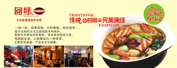 沈阳阅味餐饮管理有限公司本着“传统演绎时尚、品质决定发展”的运营理念,对中华传统美食的大力弘扬。在运营管理中,将传统产品植入酒吧式氛围空间,让人在时尚静雅的就餐环境领略精品麻辣烫的千娇百味。